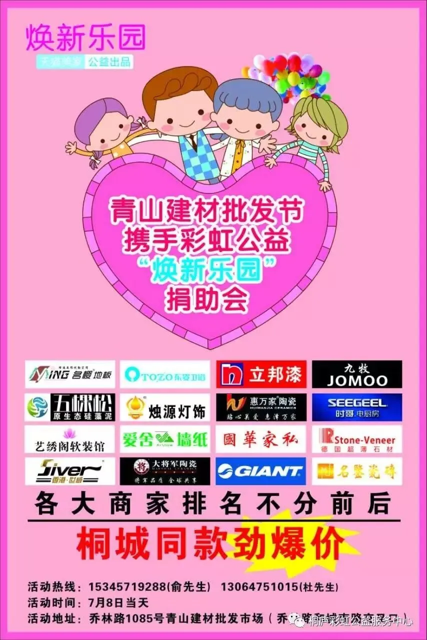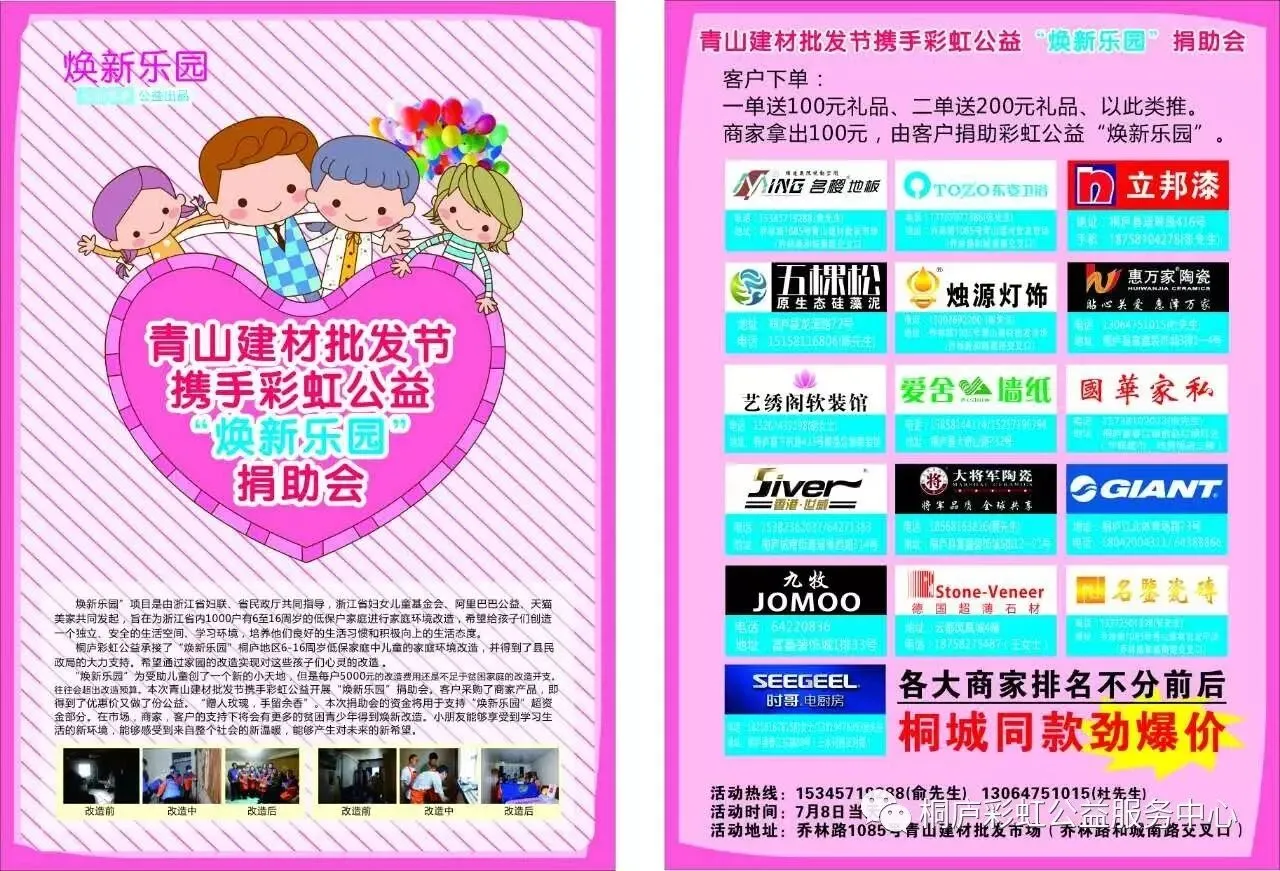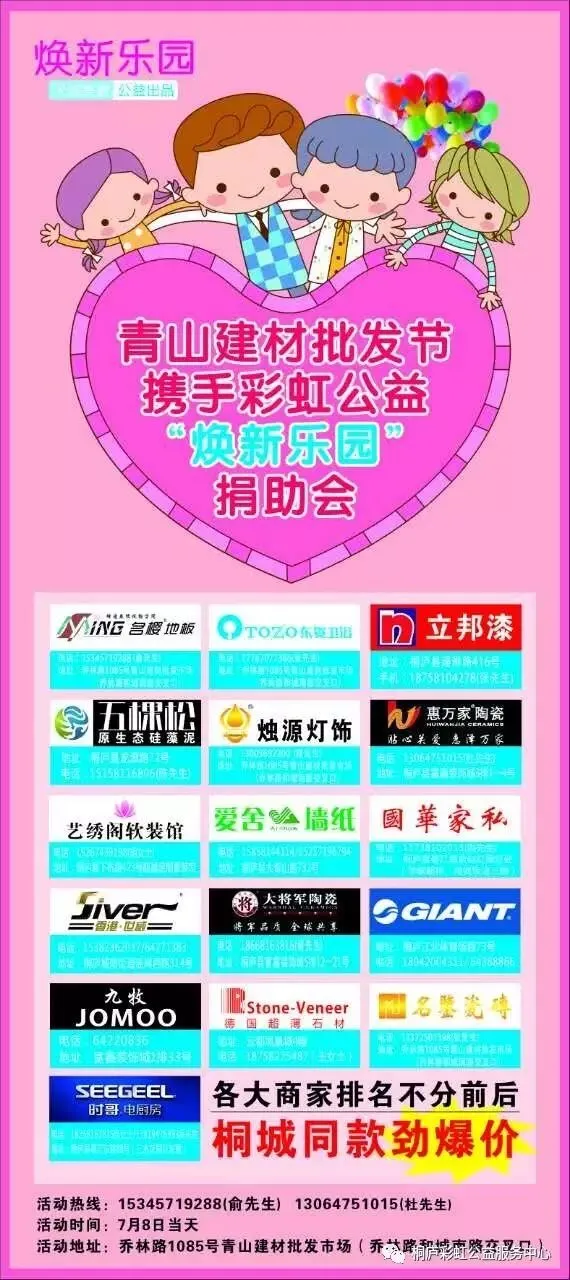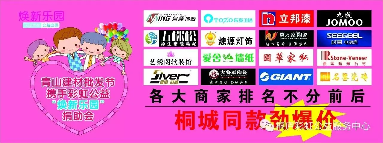 “焕新乐园”为受助儿童创了一个新的小天地,但是每户5000元的改造费用还是不足于贫困家庭的改造开支。往往会超出改造预算。本次青山建材批发节携手彩虹公益开展“焕新乐园”捐助会。客户下单采购了爱心商家的建材产品,爱心商家将为客户提供优惠的价格,还有礼品送,下一单送100元礼品,二单送200元礼品,商家还将另外再拿出100元/每单捐助彩虹公益“焕新乐园”公益项目。客户买了建材得了实惠价又做了份公益。“赠人玫瑰,手留余香”。本次捐助会的资金将用于支持“焕新乐园”超资金部分。那么这次建材市场里有哪些爱心商家在开展这次的捐助活动呢?我们来看看。