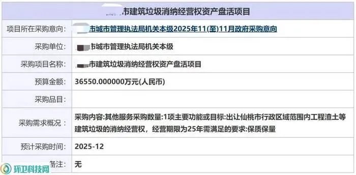 以11月17日湖北某市公开的“建筑垃圾消纳经营权资产盘活项目”采购意向为例,该项目预算3.655亿元,拟出让该市行政区域范围内工程渣土等建筑垃圾的消纳经营权,经营期限为25年。