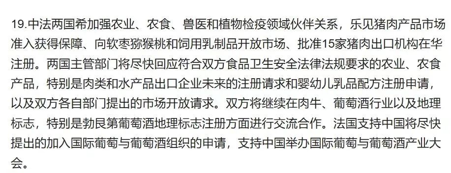 在中法联合声明中特别提出了要进一步推进葡萄酒行业的深入交流与合作。法国支持中国加入国际葡萄与葡萄酒组织,支持中国举办国际葡萄与葡萄酒产业大会。