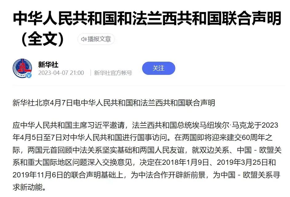 法国总统马克龙访华霸占了这两天的全网热搜。法兰西共和国总统埃马纽埃尔·马克龙于2023年4月5日至7日对中华人民共和国进行国事访问。在两国即将迎来建交60周年之际,两国元首回顾中法关系坚实基础和两国人民友谊,就双边关系、中国-欧盟关系和重大国际地区问题深入交换意见,决定在2018年1月9日、2019年3月25日和2019年11月6日的联合声明基础上,为中法合作开辟新前景,为中国-欧盟关系寻求新动能。