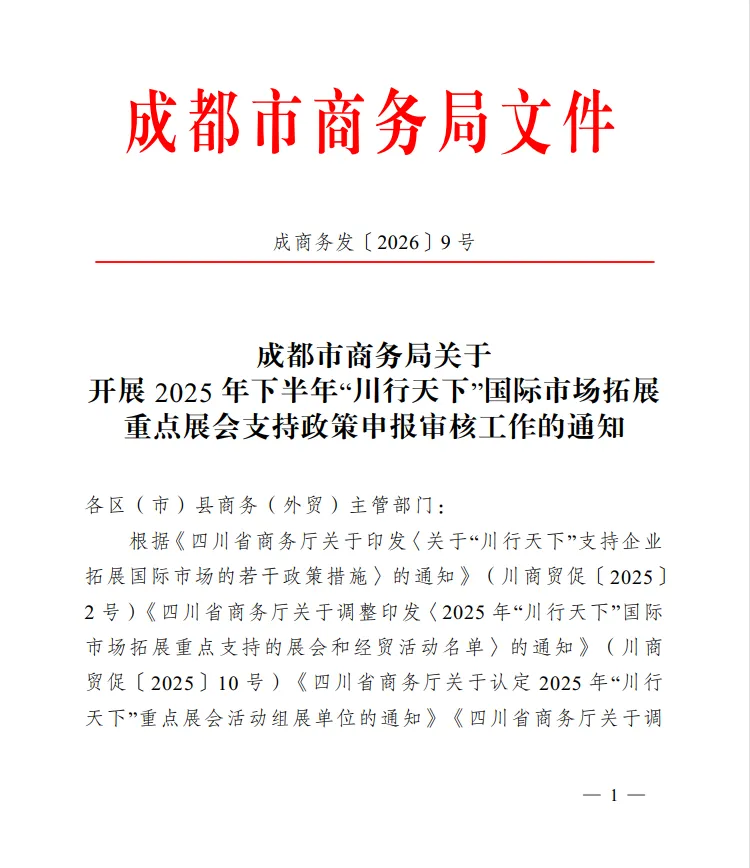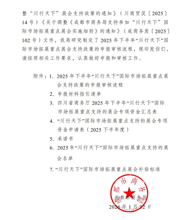 成都市2025年下半年“川行天下”国际市场拓展重点展会支持政策申报工作正式启动。此次主要针对2025年7月1日至12月31日期间参加指定境外展会的企业给予资金支持,帮助企业降低参展成本,拓展国际市场。