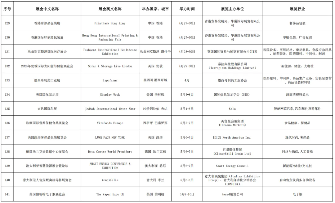 为贯彻落实省市关于加强“五外联动”工作部署,加快构建我市全面扩大开放新格局,促进国内国际双循环,支持我市企业参加境外展会、开拓多元市场,我局将继续面向大型外贸企业和服务贸易企业落实境外展会参展补贴政策。现将2026年市级重点支持境外展会清单予以发布,请大型外贸企业和服务外包企业留意我局后续相关通知。