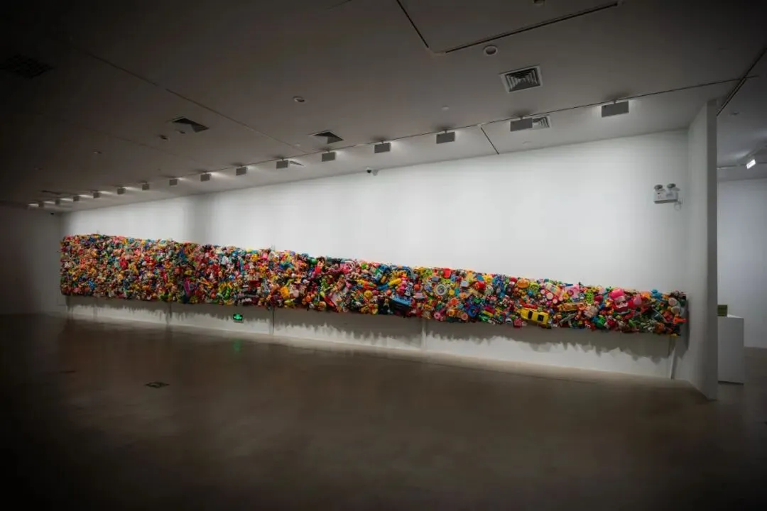 展览还汇集了安琪、才丁扎西、陈芳、董全、冯圣媖、方力钧、胡为一、靳山、鞠婷、厉槟源、莫丹洋、邱止、石至莹、唐勇、徐国峰等艺术家的作品。作为此次体量最大的作品,艺术家徐国峰用近一万件废弃儿童玩具创作的装置艺术作品《景观墙》,色彩亮丽,视觉冲击力极强,吸引了亲子家庭驻足参观。徐国峰介绍,展期内还计划推出一个共创项目,邀请小朋友携带不再喜欢的玩具,在展厅内组成一件全新的作品,增进更广泛人群的环保意识。