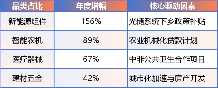 2025年,非洲B2B跨境电商品类结构呈现“高端化、刚需化、本地化”的演变趋势,新能源组件、智能农机、医疗器械、建材五金四大品类成为增长引擎,背后是政策扶持与市场需求的深度共振。