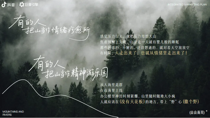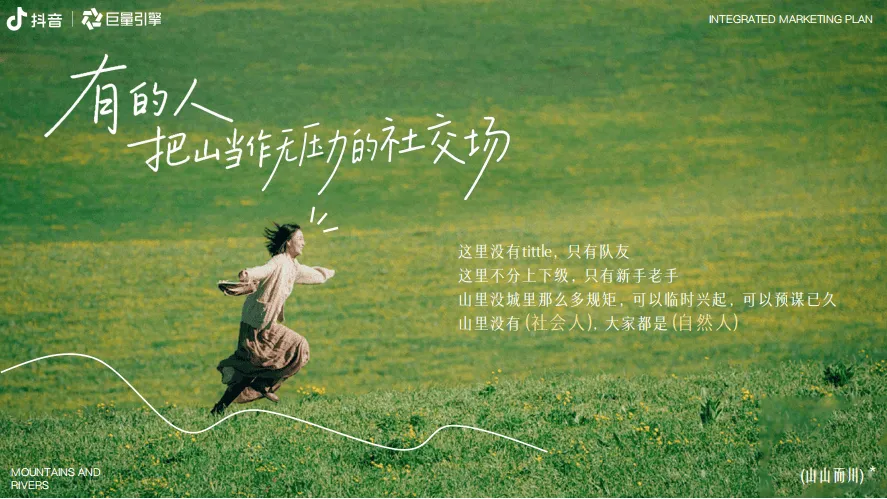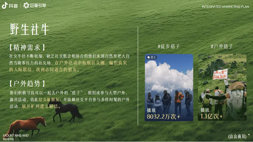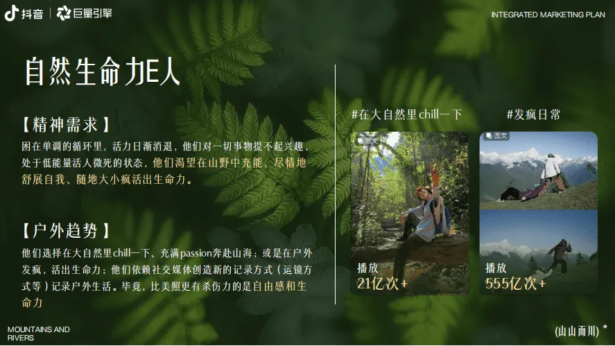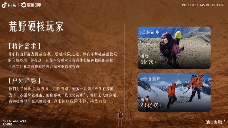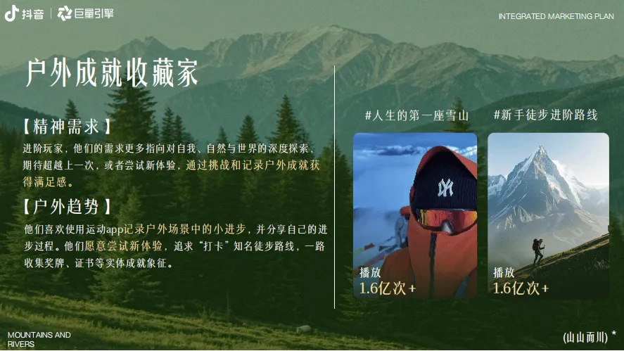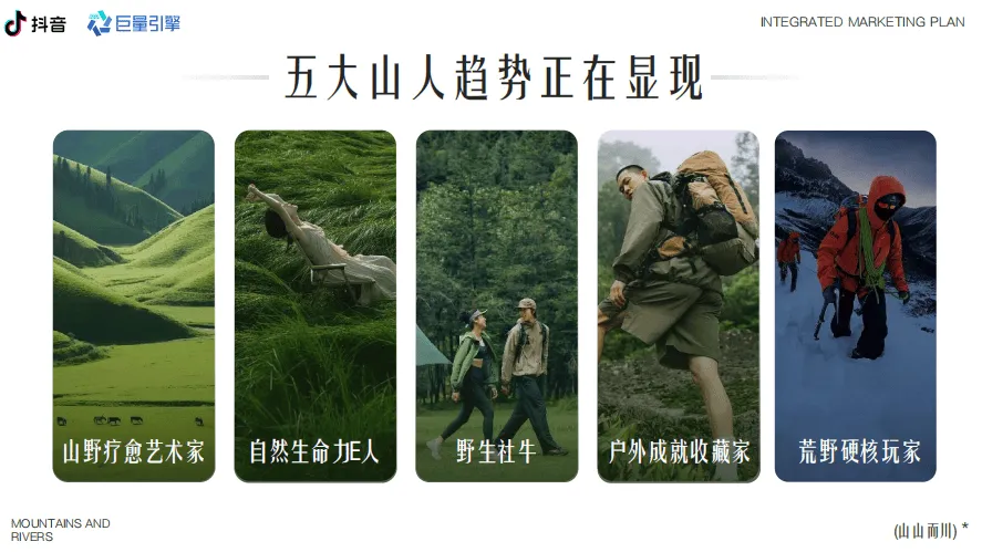 巨量引擎推出“山山而川”IP整合营销方案,聚焦服饰行业,以“向山而行、探索自我”为核心主题,精准把握当代人对户外探索的热潮与精神需求。数据显示,抖音平台户外相关内容热度持续攀升,户外新人互动量同比增长58%,径山古道等徒步路线搜索热度同比飙升246%,粉丝超10万的户外达人达3100+,户外装备相关内容超1.2万条,彰显户外经济的强劲活力。方案提炼出五大山人趋势人群:山野疗愈艺术家(追求自然静谧疗愈情绪)、自然生命力E人(在户外舒展活力)、野生社牛(以户外为社交场拓展联结)、户外成就收藏家(打卡路线记录进步)、荒野硬核玩家(挑战极限超越自我),各人群对应话题播放量均破千万甚至上亿次。营销活动分三阶段推进,8月底预热期通过“寻山人启事”释放趋势、上线山人MBTI测试及山林撒野计划话题,激活核心圈层;9月中上旬引爆期邀请明星与头部达人担任趋势发起人,发布山人宣言,联动专业户外俱乐部、品牌门店发放妙计锦囊,联合全国景区喊话引流,打造线上活动阵地;9月中下旬爆发期落地线下“山人节”,设置山野绿毯秀、五大部落漫游、山野市集、颁奖典礼等环节,实现线上线下联动。整体营销通过亿级流量曝光、明星达人助阵、跨场景资源整合,为服饰品牌提供沉浸式植入场景,既契合用户户外精神需求,又助力品牌深度触达目标客群,实现品牌理念与户外文化的深度绑定。