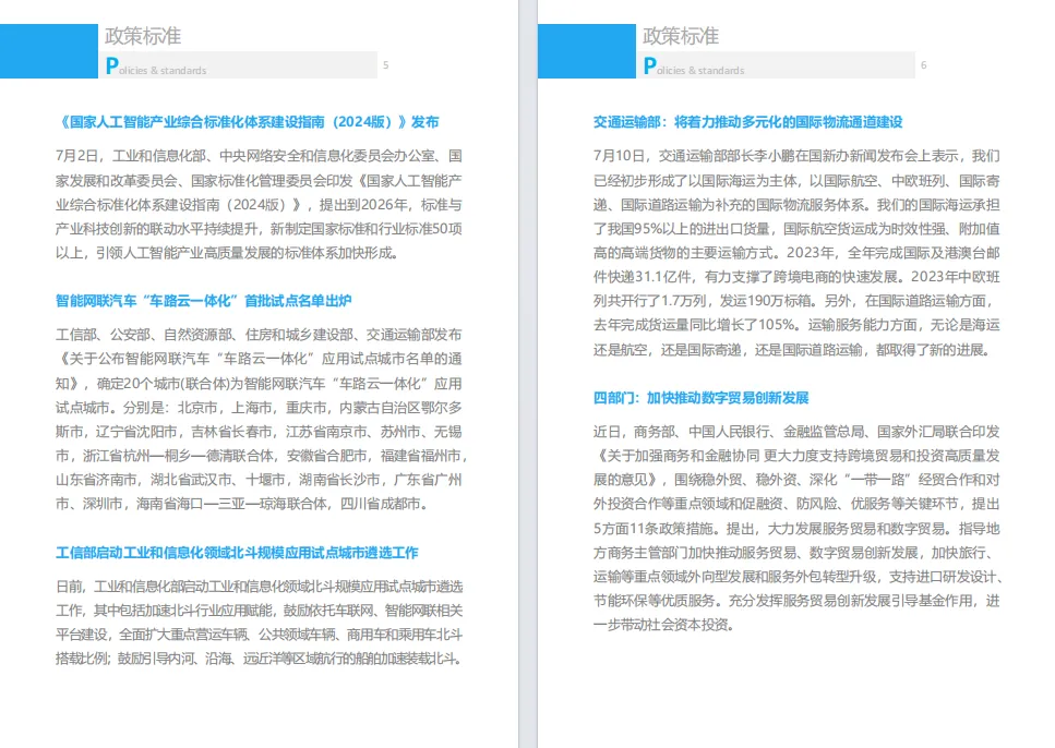 7月,工业和信息化部启动工业和信息化领域北斗规模应用试点城市遴选工作,全面扩大重点营运车辆、公商用车和乘用车北斗搭载比例;智能网联汽车“车路云一体化”首批试点名单出炉,确定20个城市(联合体)为智能网联汽车“车路云一体化”应用试点城市;《民用航空货物运输管理规定》印发,统一规范了国内国际航空货物运输秩序;全国首部地方性低空空中交规发布,主要从服务管理、运营管理、空域管理、飞行活动管理、飞行保障等方面对低空空中交通规则进行了规定……