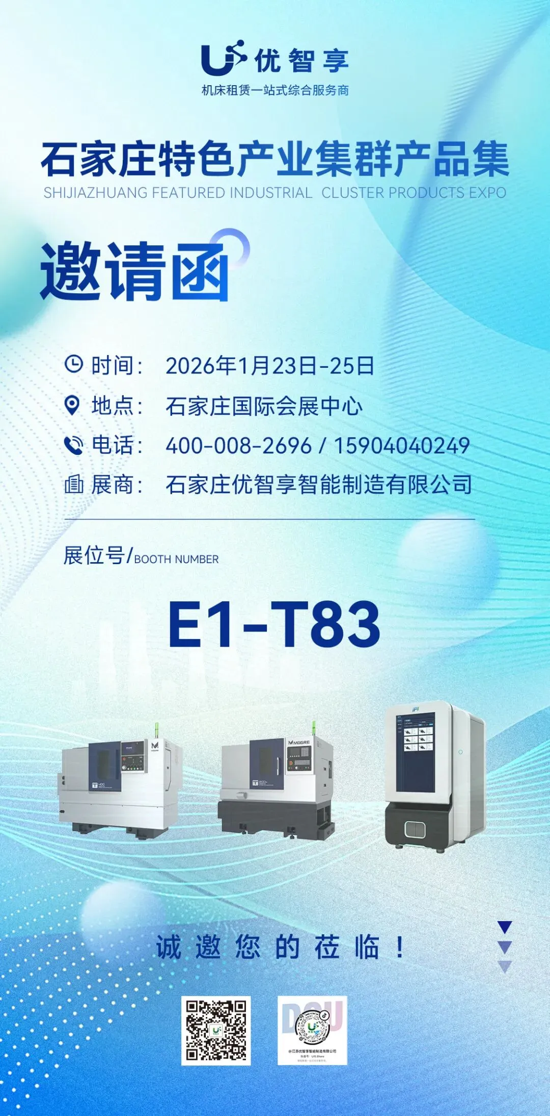 届时,石家庄优智享将携“T400智能数控车床”、“T200P智能数控车床”、“智能刀具柜”等设备亮相展位【E1-T83】,期待您的莅临!