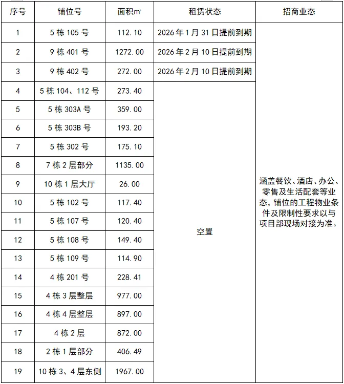 现有3家商铺即将到期,16家商铺空置招商中,铺位情况详见下表: