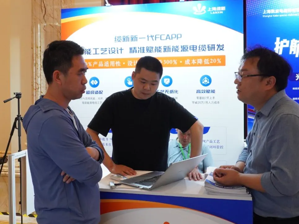 作为本次会议的赞助商,上海缆新的A01展位咨询者摩肩接踵,大家对缆新推出的线缆产品工艺数字化转型咨询及试用服务尤为感兴趣。