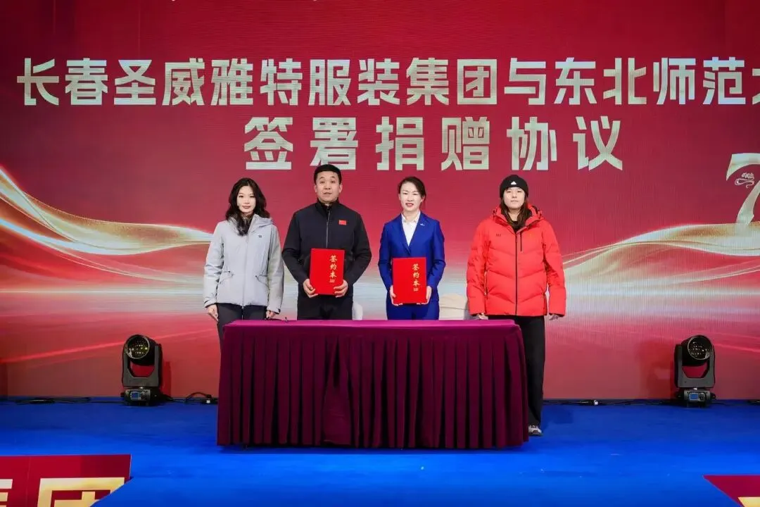同期举办了捐赠仪式,长春圣威雅特服装集团有限公司常务副总陈玉娟,东北师范大学体育学院教授、博导刘俊一代表双方签约。长春圣威雅特服装集团将每年为东北师范大学滑雪队,赠送“冰雪吉人”品牌定制款专业滑雪服30套。东北师范大学滑雪队正式成为“冰雪吉人”品牌形象代言人。