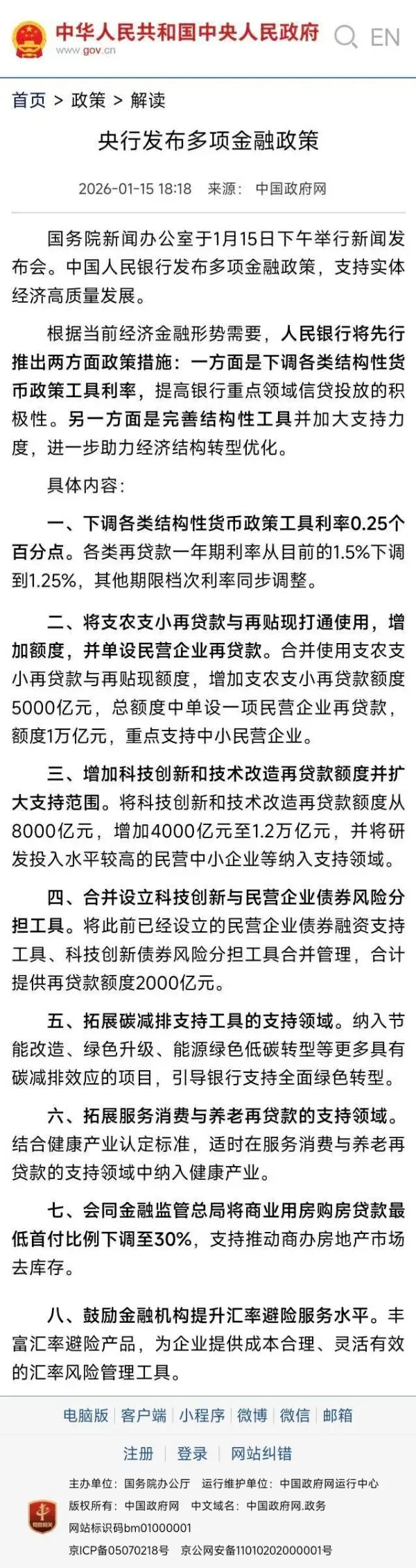 划重点: 2026年1月15日,国务院新闻办公室举行新闻发布会,中国人民银行宣布推出8项重磅政策措施,为"十五五"开局之年注入强劲金融动力。园区企业融资成本将迎来实质性下降,支持力度全面升级!