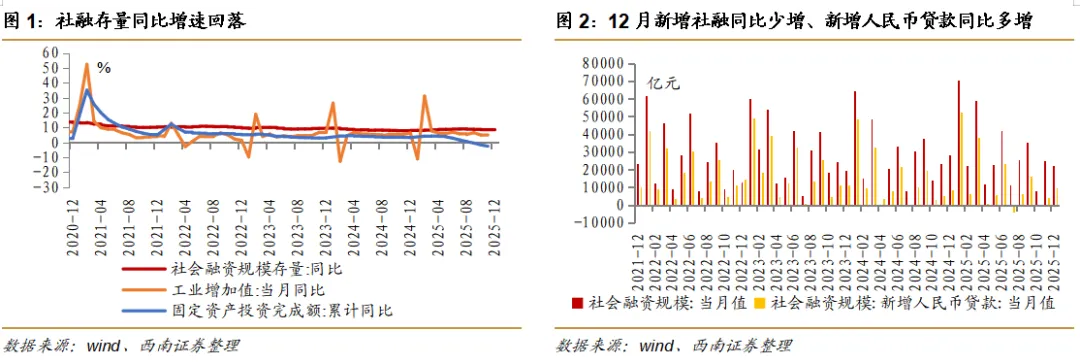 从社融存量看,2025年,社融存量同比增长8.3%,增速低于1-11月的8.5%,但高于2024年的8.0%。从社融增量看,12月社会融资规模增量为22075亿元,同比少增6462亿元。12月对实体经济发放的人民币贷款增加1402亿元,但同比在连续5个月少增后转为了多增1402亿元。12月社融同比少增主要因去年同期为政府债券融资高峰,而今年12月政府债券发行进入尾声。但新增人民币贷款同比转为多增,或与年末信贷季节性放量以及“两重”项目提前下达等因素有关。2026年1月,央行决定下调各类结构性货币政策工具利率0.25个百分点,各类再贷款一年期利率降至1.25%,其他期限档次利率同步调整,同时拓展碳减排支持工具支持领域、增加科技创新和技术改造再贷款额度4000亿元、增加支农支小再贷款额度、设立民营企业再贷款。2026年财政扩张力度有望增大,社融增速或受政府债融资支撑,保持8%以上同比增速,但由于2025年上半年基数走高,以及一季度国债到期规模较高,社融增速或保持小幅走低。