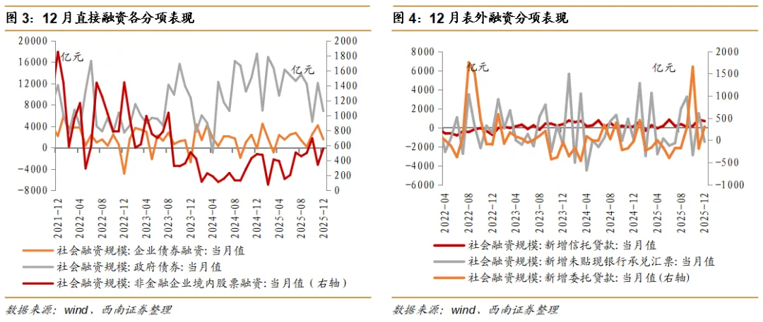 从社融结构看,2025年,直接融资新增16.7万亿元,同比多增3.2万亿元。12月,新增直接融资8933亿元,同比少增8958亿元,环比少增7630亿元,主要受政府债券融资拖累,企业债融资和股票融资为正贡献。12月,政府债融资新增6833亿元,同比大幅少增10733亿元,连续5个月同比少增,主要因去年同期基数较高,以及今年政府债券发行进入尾声,环比也较上月下降,12月地方专项债发行仅1348.94亿元,净融资1185.45亿元,较上月明显下降,2025年地方发行新增专项债规模为4.59万亿元,其中1.28万亿元用于化债,约3.31万元用于项目建设,2026年地方债开闸发行时间较早,叠加春节错位,短期有望支撑政府债融资;企业债券融资1541亿元,同比多增1700亿元,连续4个月同比多增,信用债发行持续增长,金融债发行仍是主要驱动;非金融企业境内股票融资同比多增75亿元至559亿元,与股市上涨有关。另外,新增表外融资同比少减694亿元至-505亿元,其中新增委托贷款为308亿元,同比多增328亿元,新增信托贷款为679亿元,同比多增528亿元,未贴现银行承兑汇票分别同比多减162亿元至-1492亿元。