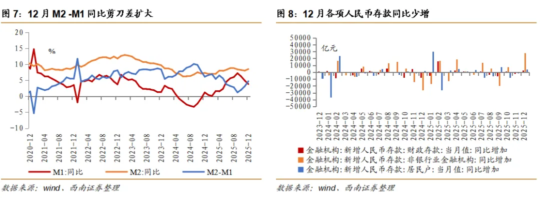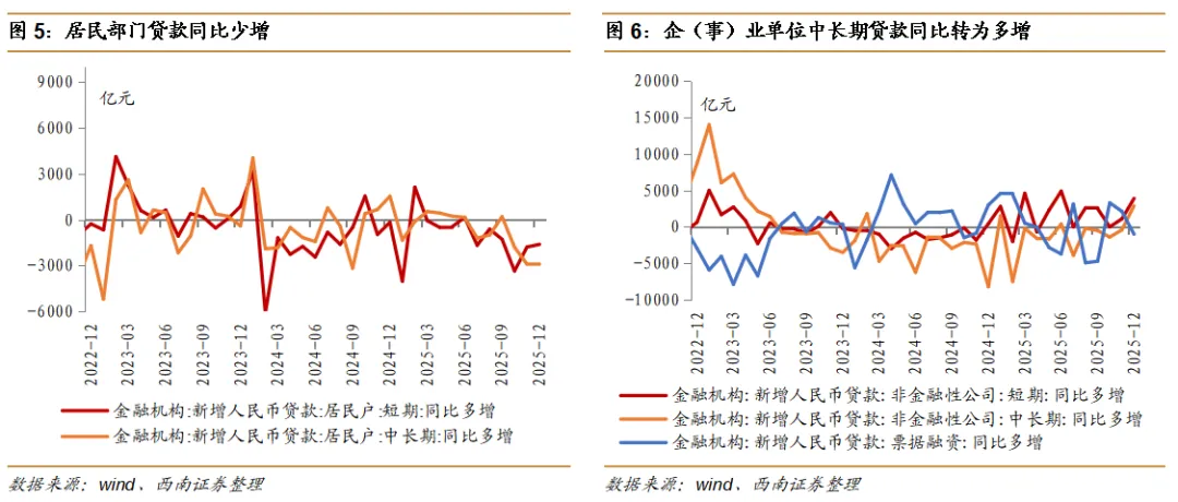 2025年,企(事)业单位贷款增加15.47万亿元,同比多增1.14万亿元。12月,企(事)业单位贷款增加10700亿元,同比多增5800亿元,企业贷款意愿有所恢复。其中,企业短期贷款增加3700亿元,同比多增3900亿元;企业中长期贷款增加3300亿元,同比多增2900亿元,在连续5个月同比少增之后转为多增,企业中长期信贷需求回升,或因“两重”项目提前下达,带动相关项目配套信贷释放,但持续性仍有待观察;票据融资多增3500亿元,同比少增1000亿元,票据冲量需求减少。2025年,居民贷款增加4417亿元,同比少增约2.3万亿元。12月,居民贷款减少916亿元,连续三个月减少,同比多减4416亿元,其中居民短期贷款减少1023亿元,同比多减1611亿元,或因年底消费场景相对单一,缺乏集中消费节点,服务消费潜力尚未充分释放,居民消费意愿仍偏谨慎,短期消费信贷需求不足;居民中长期贷款增加100亿元,同比少增2900亿元。12月,楼市成交继续偏弱,30大中城市单月商品房成交面积同比下降26.61%,截至1月14日,1月30大中城市单月商品房成交面积同比下降41.1%,居民中长期信贷需求短期或延续偏弱之势,但随着各地密集跟进的限购松绑、房贷利率下调、公积金政策优化,以及公积金贷款利率下调,地产市场有望逐步企稳。