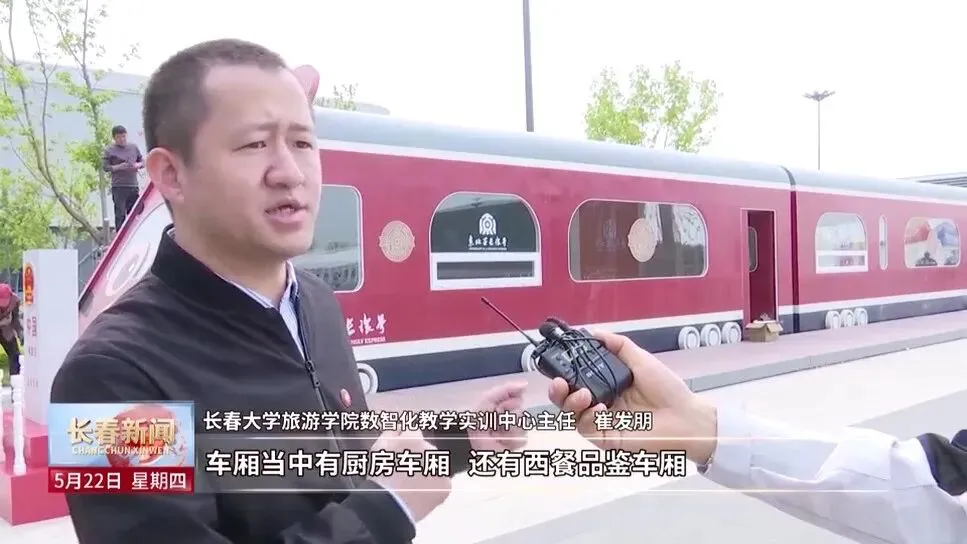 长春大学旅游学院数智化教学实训中心主任 崔发朋:车厢当中有厨房车厢、还有西餐品鉴车厢、还有茶艺展示车厢,以及直播带货车厢。通过创新创业以及教学成果展示,服务高博会这种大型活动,进而展示出来我们学校的办学特色。