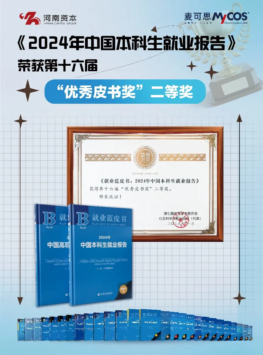 此外,麦可思撰写的《2024年中国本科生就业报告》(就业蓝皮书),在第十六届“优秀皮书奖”评选中荣获二等奖。