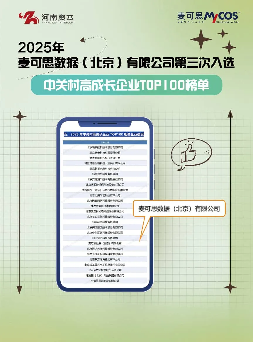 2025年12月,北京市智成高新技术企业服务平台发布《2025中关村高成长企业TOP100发展研究报告》,麦可思数据(北京)有限公司再度入选2025年中关村高成长企业TOP100榜单,这也是麦可思第三次获此殊荣。