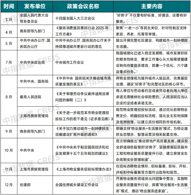 2025年以来,中央及地方各级政府陆续出台了相关政策以推动物业行业高质量发展。其中部分政策和重要会议均提到“物业服务质量提升”,明确了“十五五”期间物业管理行业的发展主线。物业管理行业将更多参与到城市更新、基层治理和民生保障等国家战略中,兼顾经济属性和民生属性。