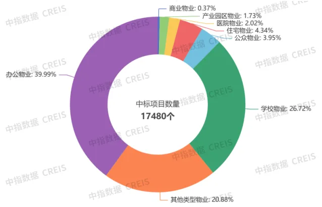2025年上海市公布中标数据共17480条,中标金额约836.74亿元。住宅业态占比为4.34%,非住宅业态占比约95.66%,在非住宅领域中,2025年中标量位居前二的业态分别为办公物业、学校物业,占比分别约为39.99%、26.72%。