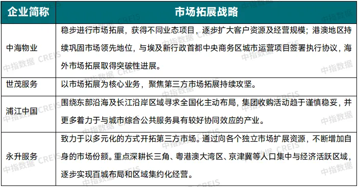 面对存量市场,物业企业坚定推行市场化拓展战略,以此驱动规模的高质量稳定增长。中海物业稳步进行市场拓展,通过丰富的市场获得不同业态项目,逐步扩大客户资源及经营规模,中海物业与埃及新行政首都中央商务区城市运营项目签署执行协议,海外市场拓展取得突破性进展;浦江中国围绕东部沿海及长江沿岸区域寻求全国化主动布局,集团收购活动趋于谨慎稳妥,并更多着力于与城市综合公共服务具有较好协同效应的产业,例如投资性房地产的转租服务、城市公共停车资源运营等,同时基于物联网、互联网、3D技术、大数据等各类技术,以物业管理作为先导业务展开专业服务;永升服务致力于以多元化的方式开拓第三方市场,坚持“投前精选标的,投后完善管理”的原则,通过战略并购,提高现有市场占有率,扩大区域业务规模,快速打破业态壁垒,增强多种业态服务能力。