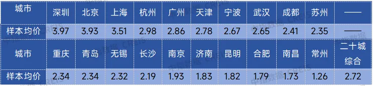 2025年二十城物业服务均价为2.72元/平方米/月,环比下跌0.09%,同比下跌0.23%。一线城市物业服务价格水平居前列,其中深圳均价最高,为3.97元/平方米/月;北京、上海紧随其后,分别为3.93元/平方米/月和3.51元/平方米/月。