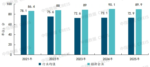 2021-2025年,全国物业服务客户满意度得分整体呈现波动下行态势,2025年全国物业服务满意度降至72.9分。其中,标杆企业的客户满意度虽然显著高于全国整体水平,但是今年得分首次出现下滑(同比降0.2分)。从分项指标来看,车辆管理和装修管理的满意度得分最低,显示出物业服务企业在基础服务品质提升方面仍存在较大空间。
