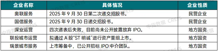 国资背景企业仍是潜在主力,地方国资企业深业运营、联投城市运营和瑞景城市服务均处于IPO进行中。其中,深业运营四次递表失败后仍未披露放弃IPO,瑞景城市服务已公开招标IPO中介团队。