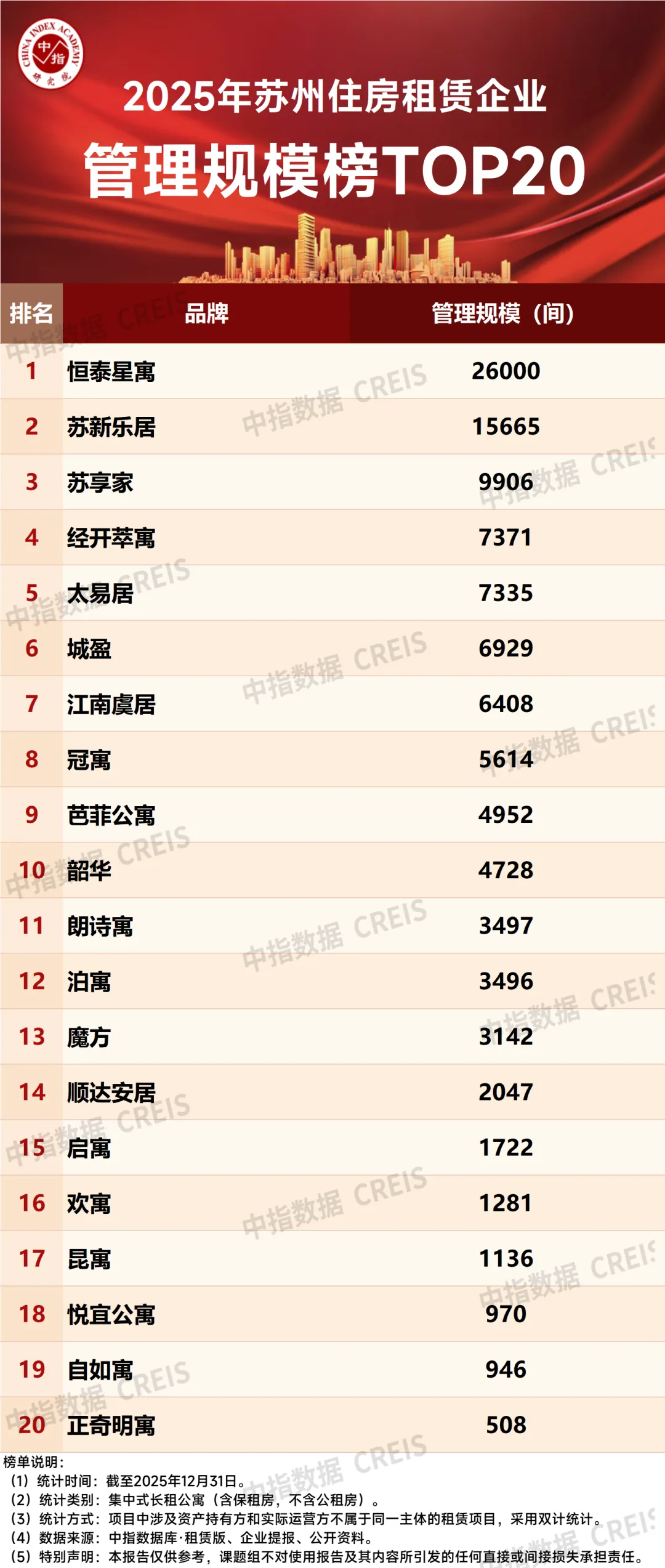 企业格局:2025年12月,在苏州市房协的指导与支持下,依据租赁企业报送数据以及中指数据库·租赁版数据,评选出苏州市住房租赁企业开业/管理规模TOP20。本次榜单入围门槛为508套。