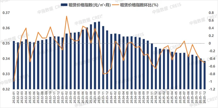 2025年12月,住房租赁市场处于传统淡季,租住需求规模维持低位运行,重点50城住宅平均租金环比继续下跌。根据中指50城住宅租赁价格指数,12月,全国50个城市住宅平均租金为34.16元/平方米/月,环比下跌0.60%,跌幅与11月持平;同比下跌3.62%,跌幅较11月扩大0.05个百分点。