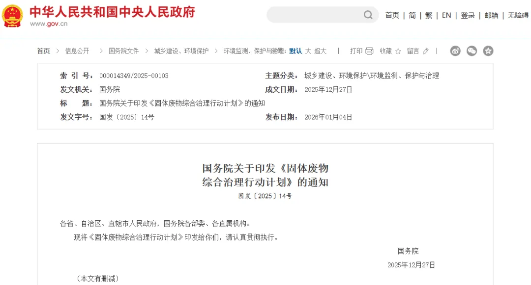 2026年开年,国务院印发《固体废物综合治理行动计划》(俗称“固废十条”),这是我国首个专门针对固废治理的系统性政策,标志着固废治理从“单点治理”升级为“全链管控”。对工业企业来说,这不是“选择题”而是“必修课”——未来5年,大宗固废综合利用量要达45亿吨,再生资源循环利用量要破5.1亿吨,监管只会更严、资源价值只会更高。