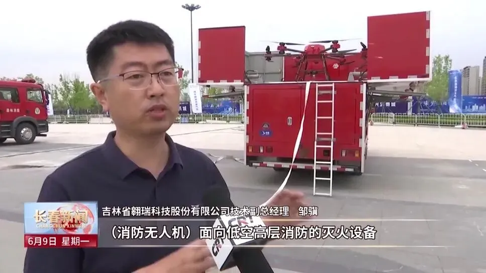 吉林省翱瑞科技股份有限公司技术副总经理 邹骥:(消防无人机)面向低空高层消防的灭火设备,它的最大特点是能够载重60公斤以上,到达150米的高度,在这个高度能真正实现对高层内部的着火点进行有效灭火。