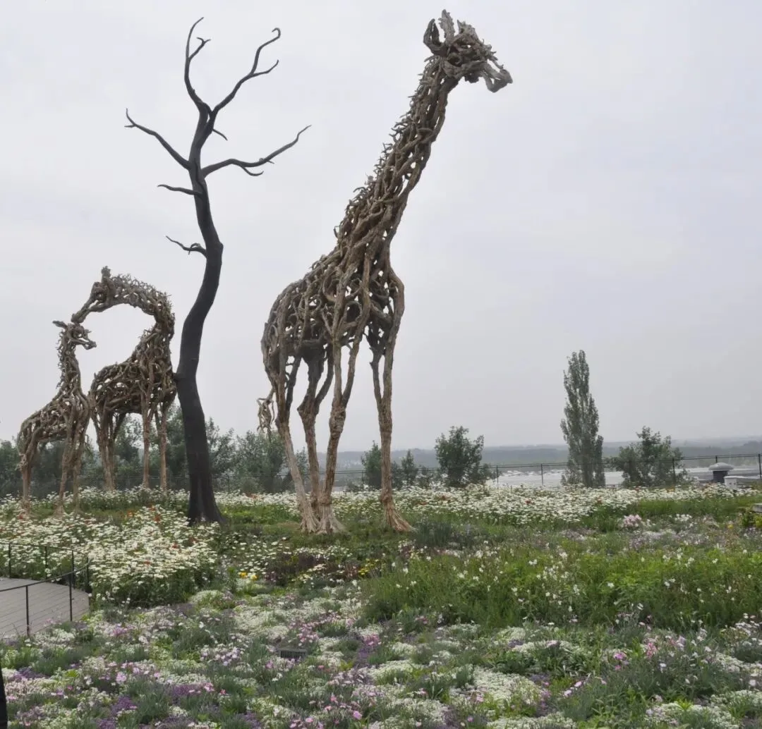 这三只长颈鹿是世界上最大浮木动物雕塑,总高10米、重达10吨。2019年,他们从菲律宾出发,经过近一个月的海上漂泊到达世园会现场,入驻植物馆顶,深受游客欢迎。出自英国艺术家詹姆斯·多兰·韦伯之手。(资料来自于网络)。