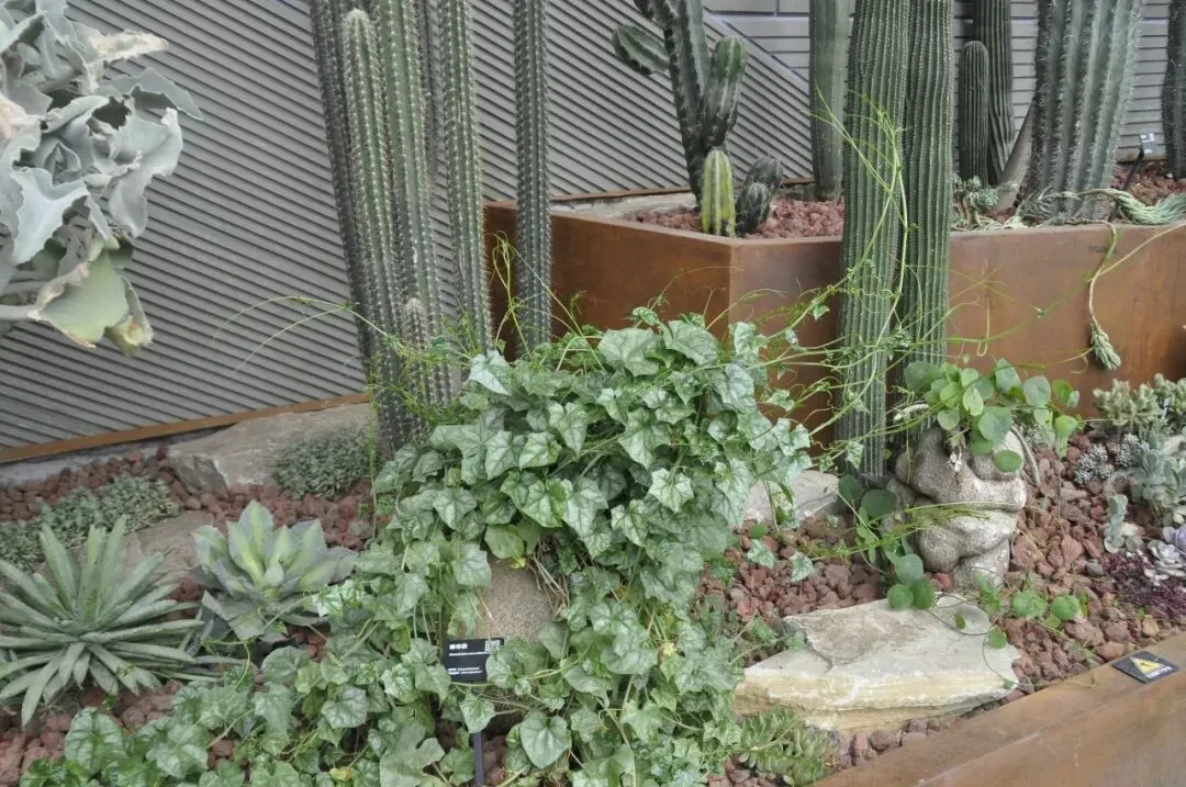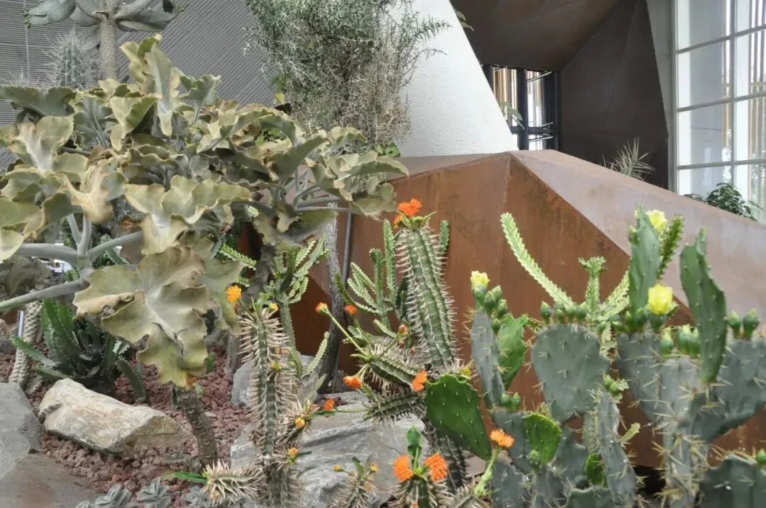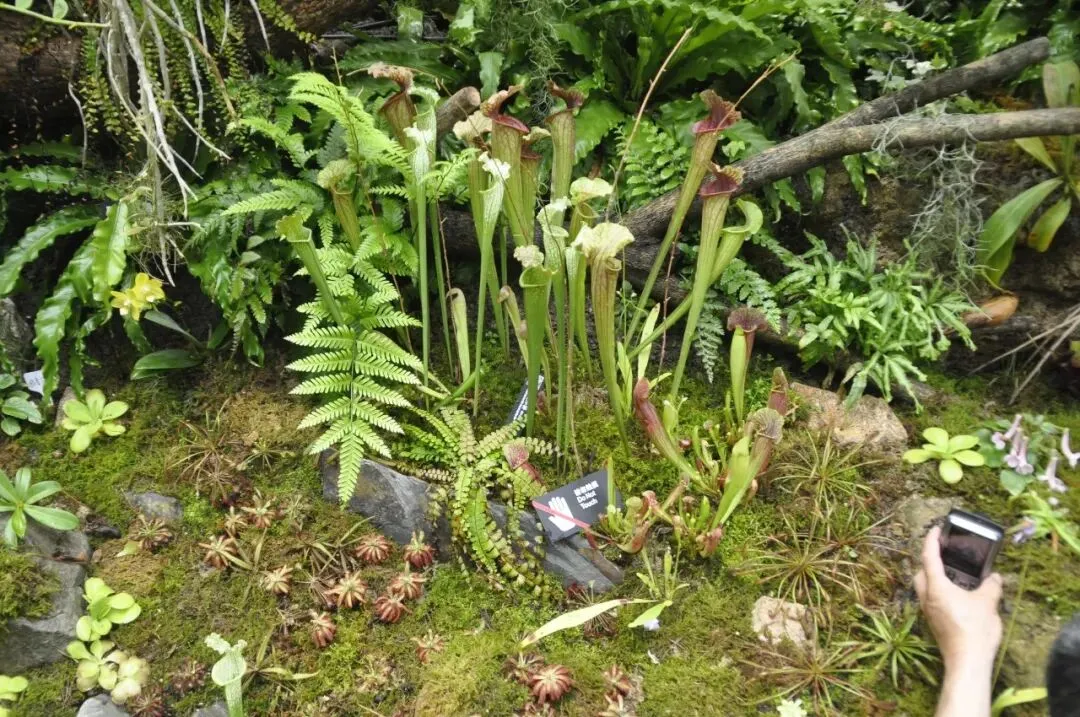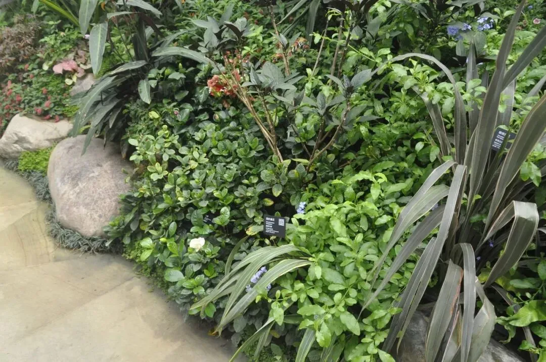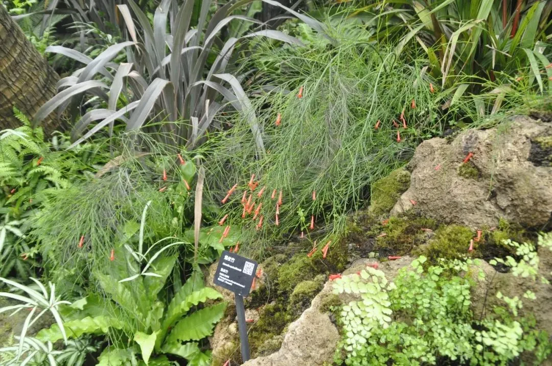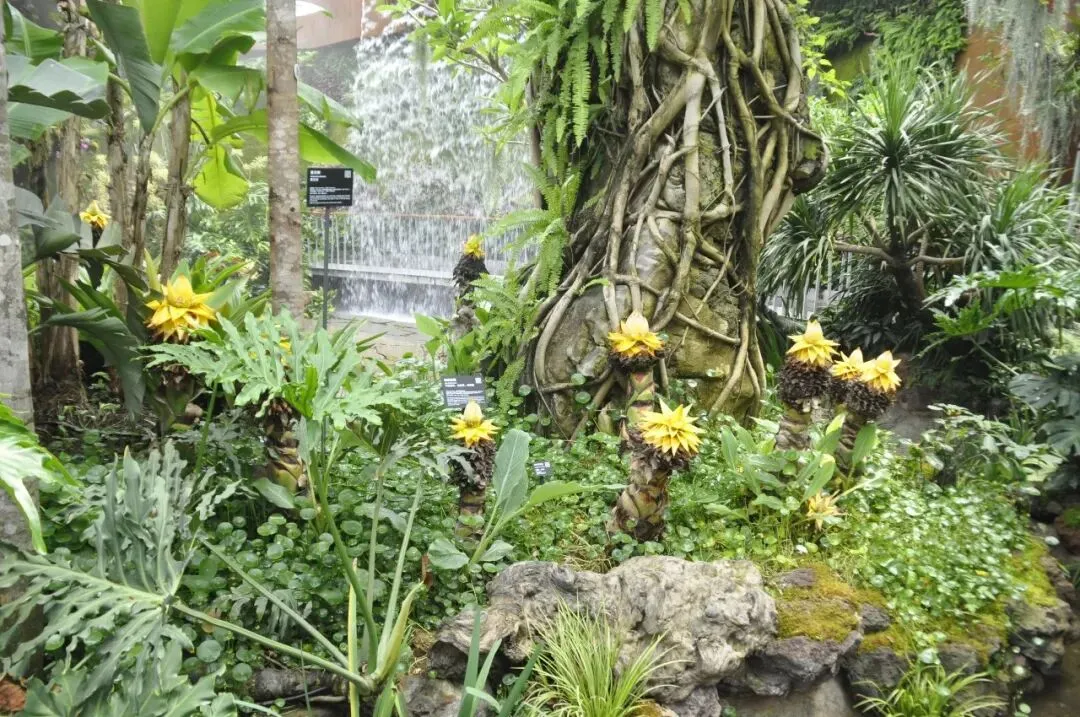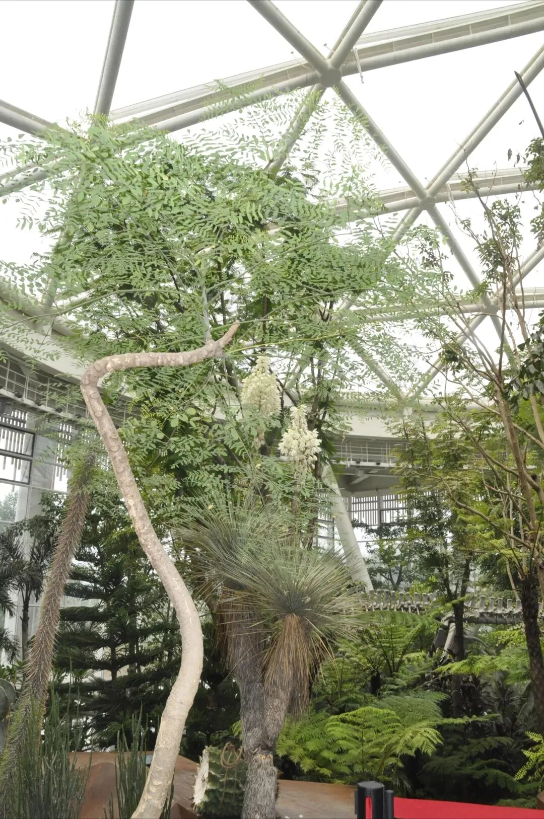 (7)红海榄,红树林,其实到了南方也难得一见,是沿海防护林体系重要的组成部分,作为曾经学林学的人,还是很是惊喜。(12)浅裂睡布袋+仙女之舞,左侧是仙女之舞,右侧是浅裂睡布袋,这个标识牌不太对(15)青果榕树,又名杂叶榕,青果榕树,高19米的青果榕树,百岁树龄,被亲切地称为“大板根爷爷”,是植物馆的“镇馆之宝”。它来自云南西双版纳,展示出了热带植物如何长高的秘密。(19)象腿树,背后的“稻草人”鸟喙丝兰,竟然开花了。据说稻草人能忍受零下20度的低温,但怕热,这么好的东西为啥没有推广到园林中而躲在温室之中,2025年国庆在太原植物园温室又看到了它。移天缩地在君欢-微型园林