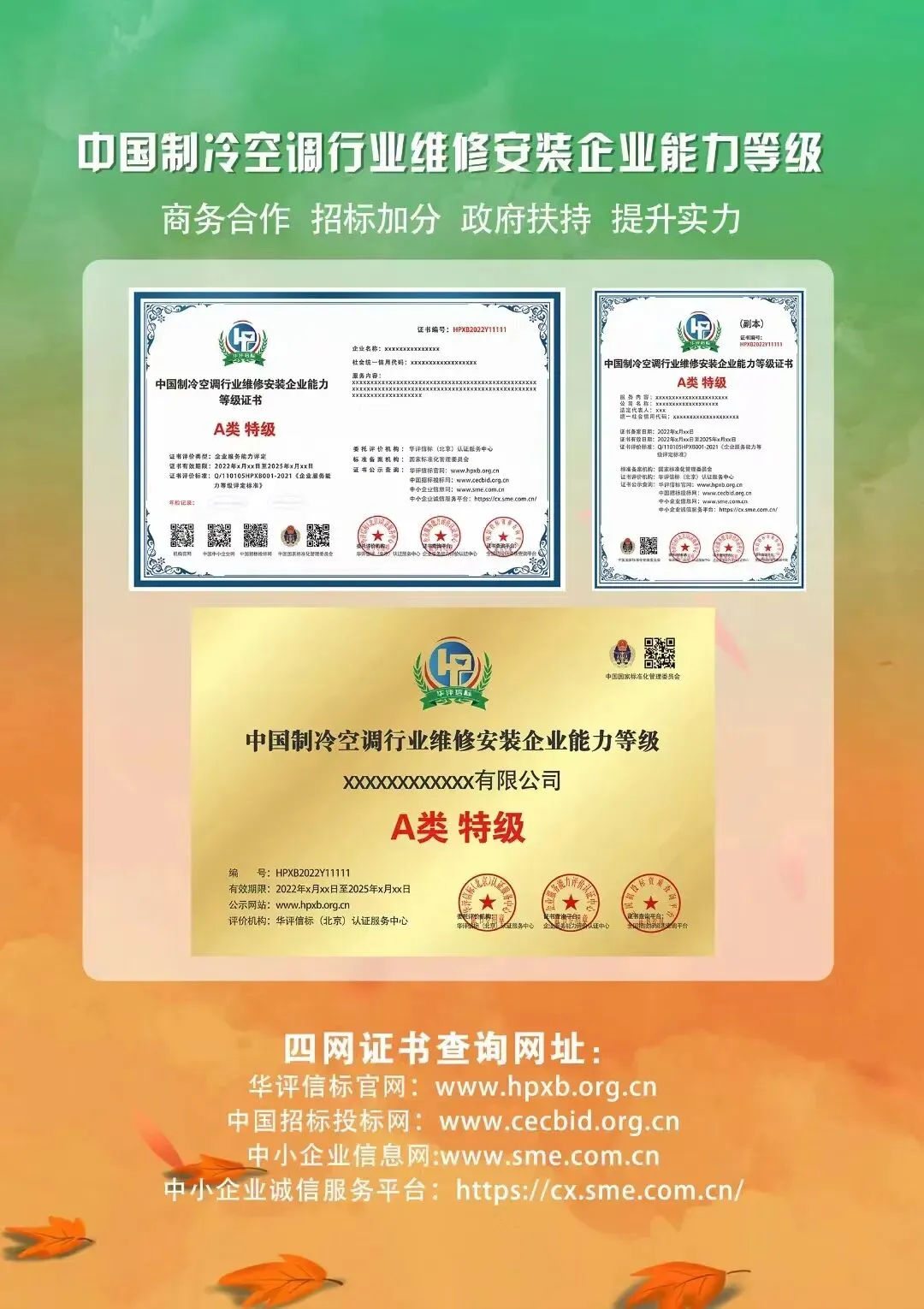 为加强和帮扶空调行业服务企业在招投标过程中的竞争力和服务认可度,港擎工程顾问集团与认评机构合作推出《中国制冷空调行业维修安装企业能力等级》(A类特级、I级、III级、IV级)证书的申办工作。所认定结果将在工信部/中国招标投标网、工信部/中国中小企业信息网、机构平台等三网公示查询,网上背书等。
