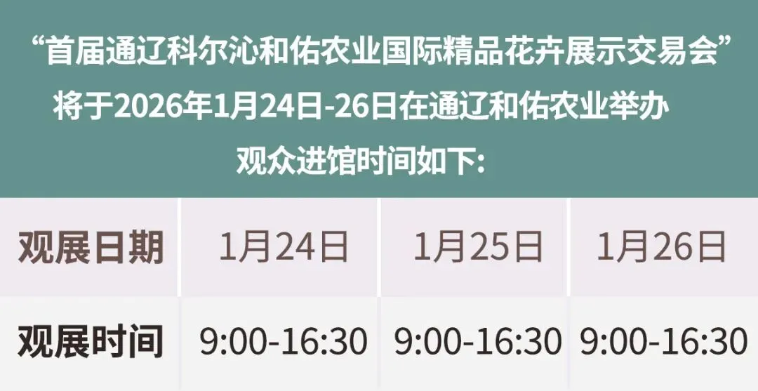 目前,“首届通辽科尔沁和佑农业国际精品花卉展示交易会”的参展商报名通道已开启,请收下这份攻略宝典,展会日程、交通、住宿、观展指南、报名一键掌握~