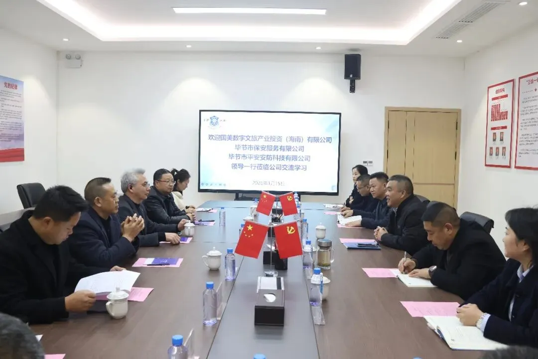 2026年1月15日,国美数字文旅产业投资(海南)有限公司、毕节市保安服务有限公司、毕节市平安安防科技有限公司等企业代表组团莅临仁怀市保安服务公司,开展考察交流活动。公司党总支书记、董事长肖都树,国美数字文旅产业投资(海南)有限公司总经理罗之,毕节市保安服务有限公司董事长谌林,毕节市平安安防科技有限公司总经理王继福及双方相关负责人参加。