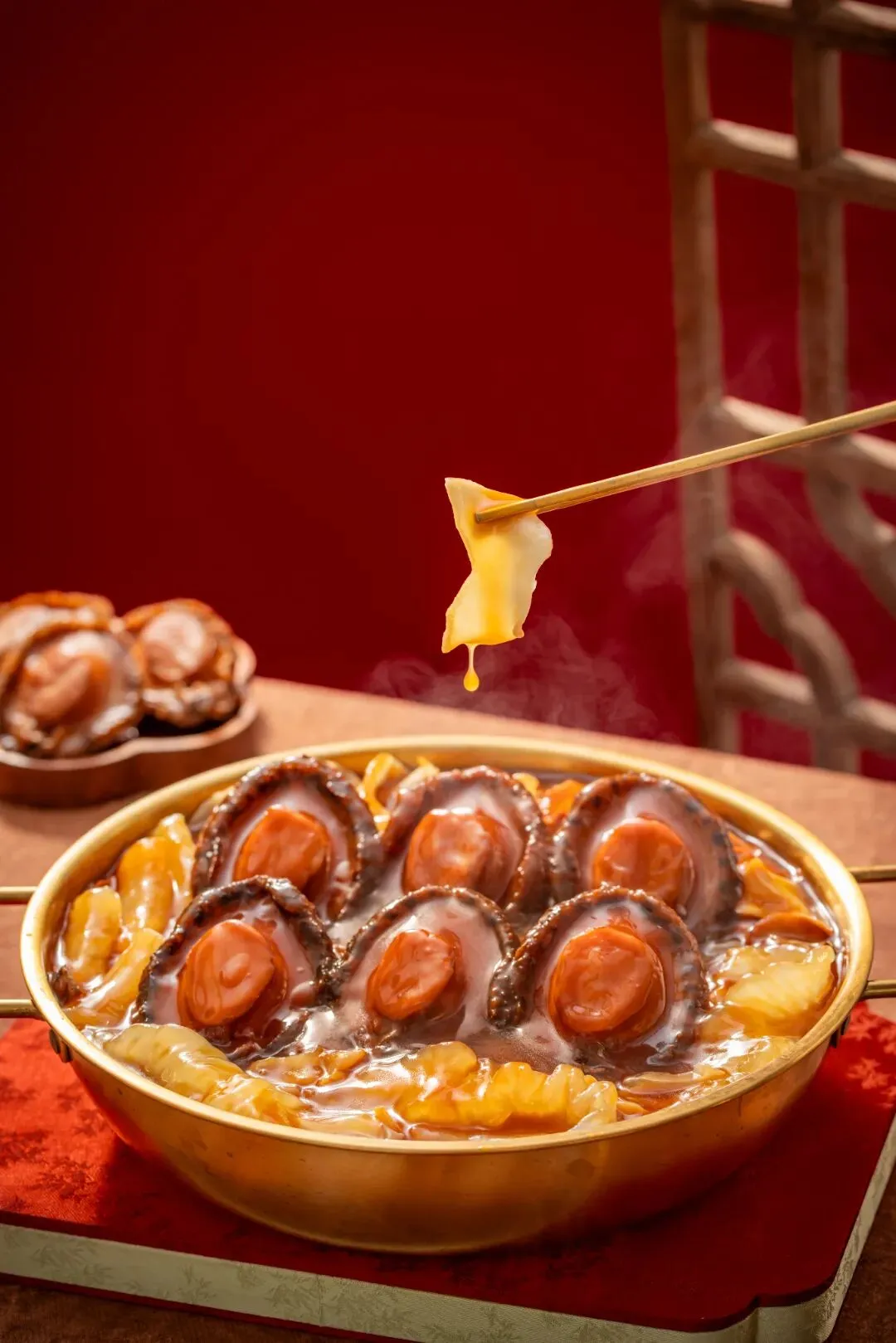 鲍鱼大盆菜以精选连江3-4头规格鲍鱼加工成全鲍宴为核心,辅以进口鱼胶并采用传统水发工艺,更以10小时慢熬鲍汁精心调制。