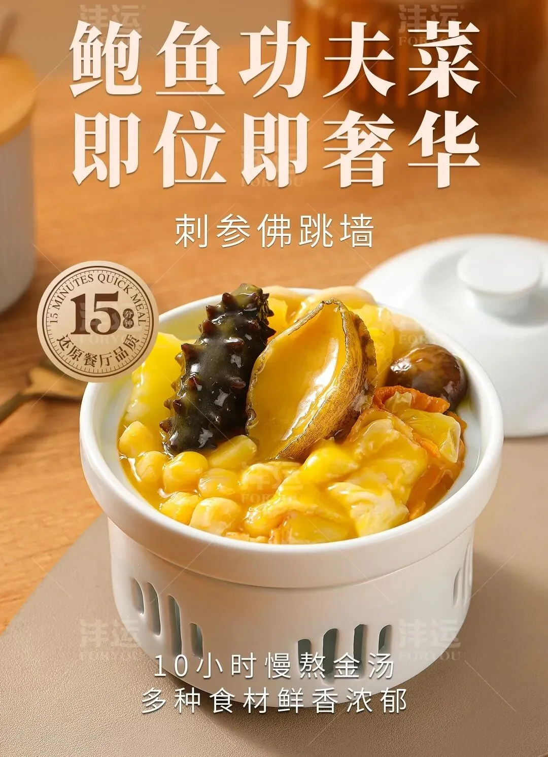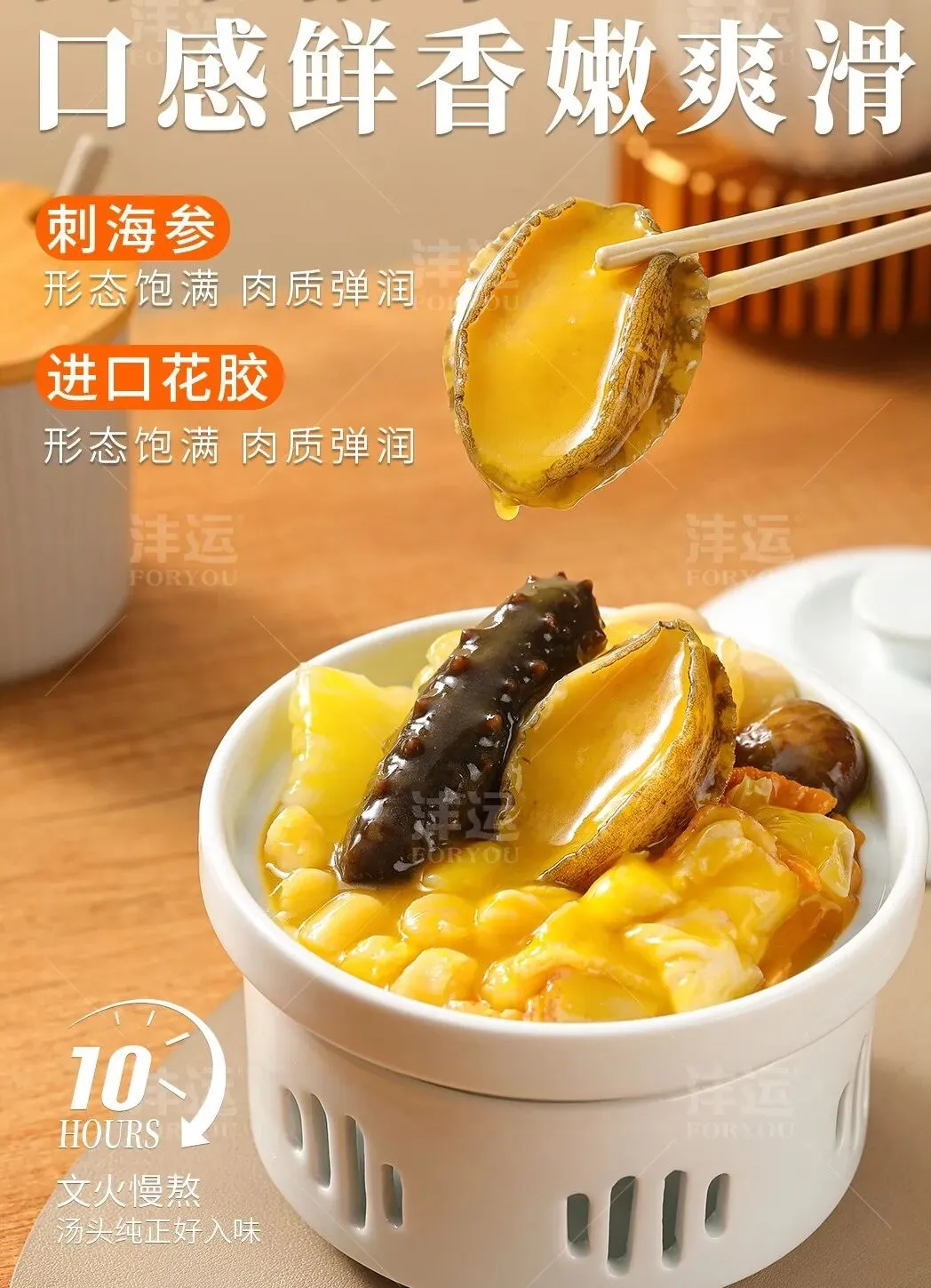 严选进口野生捕捞海参与甄选连江鲍鱼,以10小时慢熬金汤为底,融汇10味山海食材,凭借精湛工艺将山海之鲜层层锁入,成就醇厚鲜香的经典滋味。