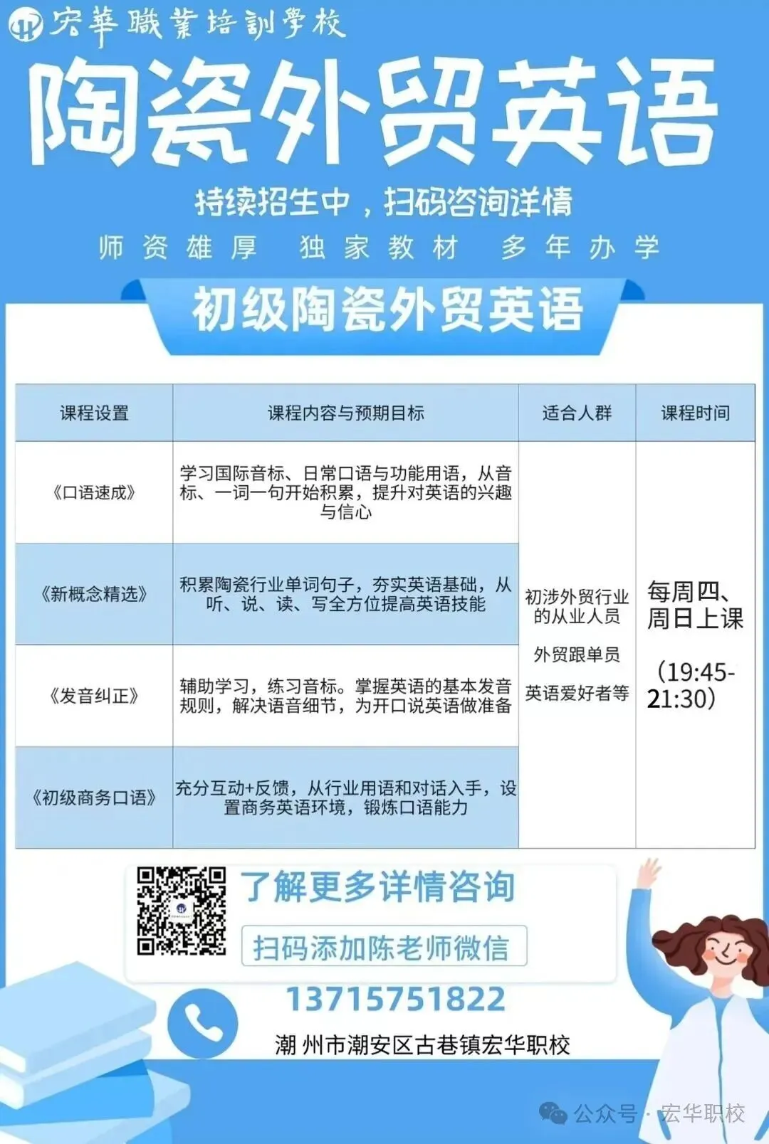 根据不同基础水平的学员,陶瓷外贸商务英语分为初级和中高级两个课程。