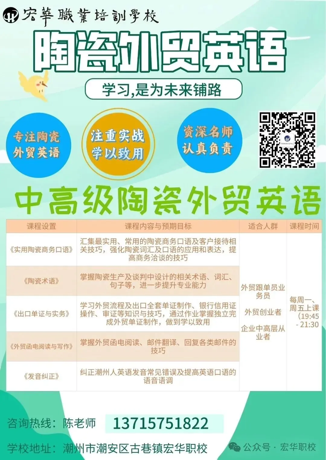 课程亮点:深入讲解陶瓷行业的专业术语、实用商务口语、国际贸易全流程、单证等,通过案例分析、小组讨论和模拟实战等多样化的教学方式,让学员能够掌握商务沟通技巧!