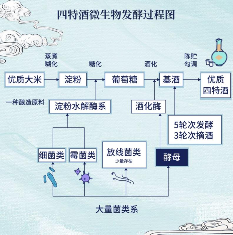 白酒是中国特有的一种蒸馏酒,由淀粉或糖质原料制成酒醅或发酵醪经蒸馏而得,以曲类、酒母为糖化发酵剂,利用淀粉质(糖质)原料,经蒸煮、糖化、发酵、蒸馏、陈酿而酿制成的含有酒精的饮料。酿酒是一个系统工程,是很多种微生物团结协作的成果。一般来说,酒的风味越丰富,参加酿酒过程的微生物越复杂。