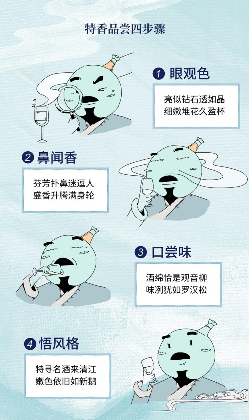 “名酒来清江,嫩色如新鹅”。四特酒其香闻之清雅,饮后浓郁,回香独特,其味入口醇甜绵软,味感绵长,酒体香味物质协调,饮之不干口、不上头,且香气馥郁、优雅、持久,回味恰到好处,嗝香愉快,有心旷神怡之快感。品酒,品的是酒,更是人生滋味。特级的香型,需要特级别的品味方法。四特酒每一缕芬芳和每一滴醇香中都富含着独特的地域特色和人文气息,品味四特酒需通过视觉、嗅觉、味觉和心觉综合感受时光陈酿和自然馈赠带给美酒的价值。(舒菲)