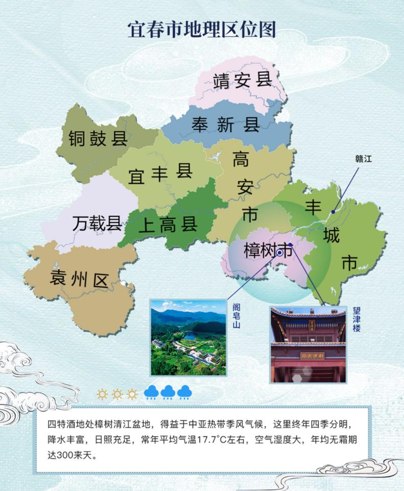 樟树市域之东为全国主要粮食生产基地的丰城,之西为太阳之城新余,之南为橘都新干,之北为宜居名郡高安,樟树恰到好处的位于正中位置,兼备四大名城气候特点,包罗千秋百代的酿酒有益微生物在此栖息留存,为酿制富有传奇风味的四特酒提供了源源不绝的“动力”。
