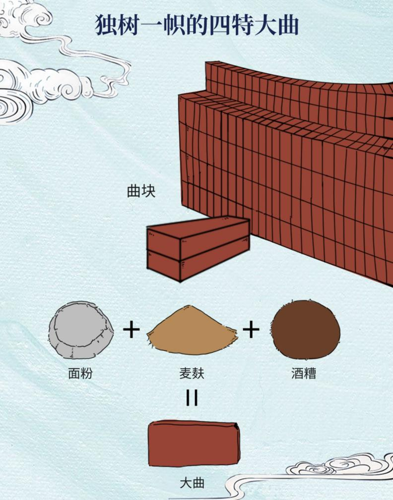 四特酒大曲原料采用面粉、麦麸和酒糟,在白酒领域中独树一帜。酒糟的使用,有助于酿酒发酵中有益微生物的循环再利用,并对大曲起到疏松的作用,利于好氧性微生物的生长繁殖。与此同时,四特酒采用中高温发酵工艺,酒体既有高温曲的酱香、浓香,又有中温曲的清香,再加上优质整粒大米的米香,诸香合一,回味无穷。