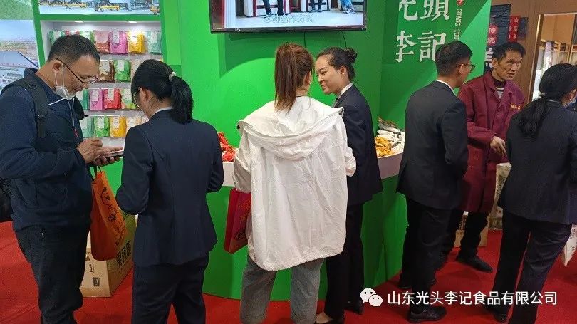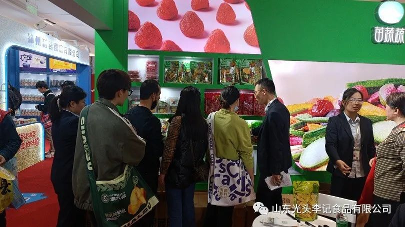 开展当天,光头李记展馆就迎来一波又一波的客流高潮,高颜值又美味的果蔬脆,就是光头李记最大的杀手锏,时时刻刻吸引着人们的目光,吸引着广大顾客驻足参观,品尝咨询