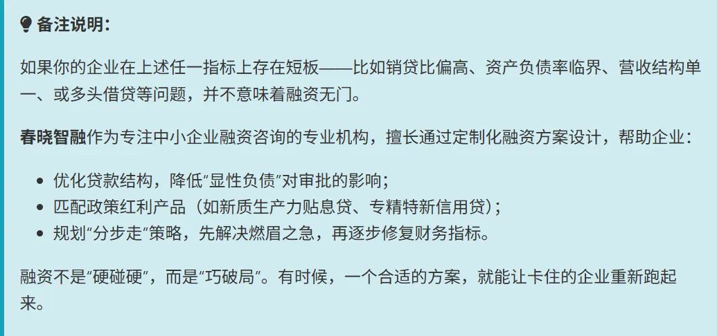 1.盈利能力:财务报表显示持续亏损是重大风险信号。银行要求查看近一年及当期利润,虽非唯一否决标准,但需有合理解释(如战略性投入期)。2.销贷比(关键指标):公式为 (企业已支用的经营性贷款总额 ÷ 年销售收入)。银行要求此比率最好不超过50%。例如:年营收1000万,已有经营贷款不应超过500万。此指标直接衡量你的销售规模能否覆盖现有负债。3.资产负债率:公式为(总负债 ÷ 总资产)。主流银行普遍以70%作为健康警戒线——这意味着企业自有资本仍占主导,具备较强的抗风险能力;若资产负债率在70%至80%之间,并非完全不可贷,但通常需要追加担保措施(如房产抵押、第三方保证)或通过专业资产评估提升授信依据,以弥补信用敞口;一旦超过80%,审批难度将显著上升,银行会要求提供详尽的经营改善计划和现金流支撑证明;而若超过100%(即资不抵债),则基本无法获得纯信用贷款。简言之,70%是银行眼中的“舒适区”,但并非绝对红线,合理的增信安排往往能让略超比例的企业依然赢得融资机会。4.贷款机构数:银行忌讳企业同时在多家机构有贷款,被视为“多头借贷”。经营性贷款笔数建议严格控制在5笔以内。若超限,可先结清部分小额贷款,待新贷款批复后再行支用。5.营收增长趋势:银行必看近三年财报。持续稳定增长是最受青睐的状态;若连续大幅下滑(如超过50%),则被视为经营恶化,基本无法获批。6.征信健康状况: