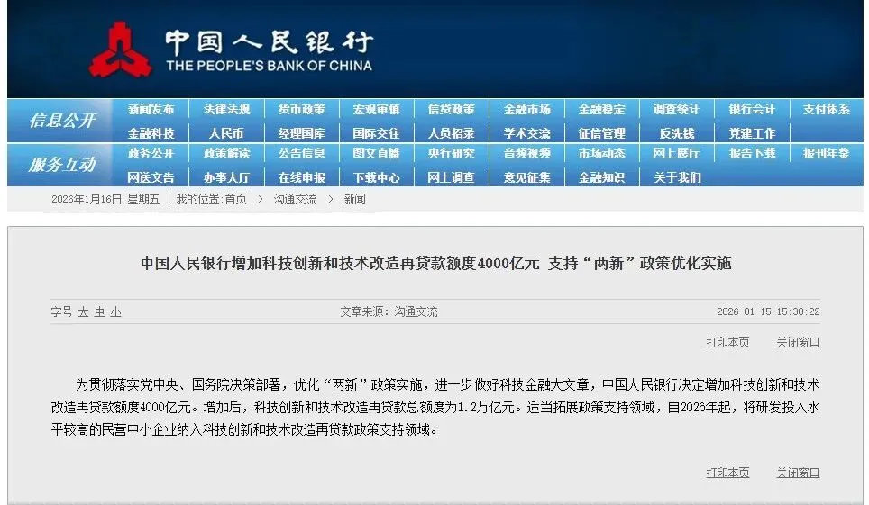 央行在2026年1月重磅推出民营企业再贷款工具,总额度达1万亿元,由5000亿元现有支农支小再贷款额度划转+5000亿元新增额度组成,专门投向民营中小微企业 。这一政策首次将民营中型企业纳入专项支持范围,填补了此前融资支持的“中间缺口”,通过低成本资金引导金融机构加大信贷投放,破解民营中小企业流动性难题。