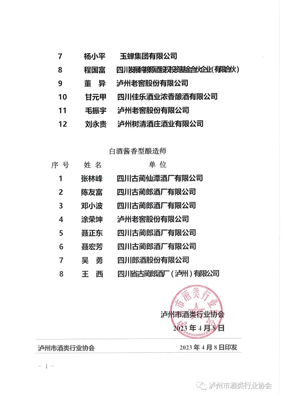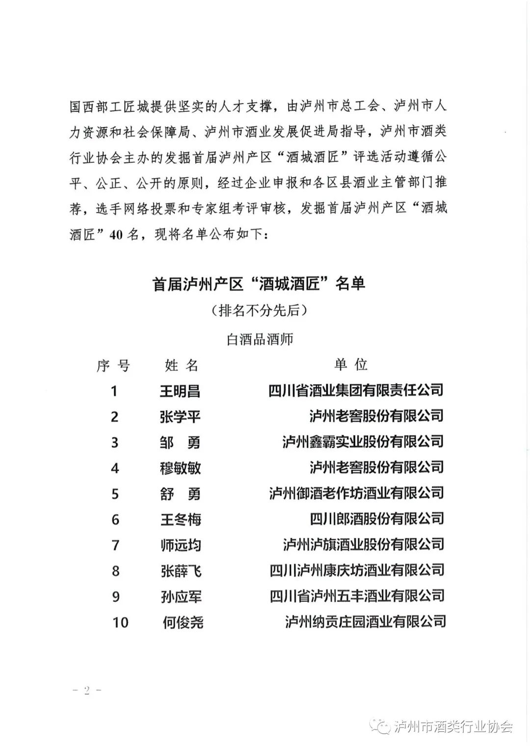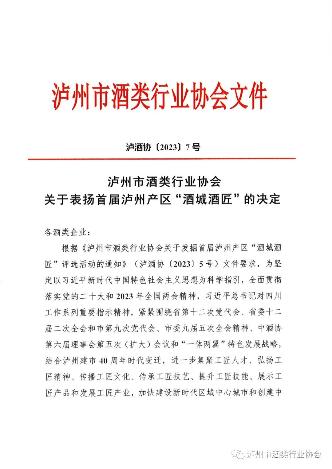 泸州市酒类行业协会关于表扬首届泸州产区“酒城酒匠”的决定