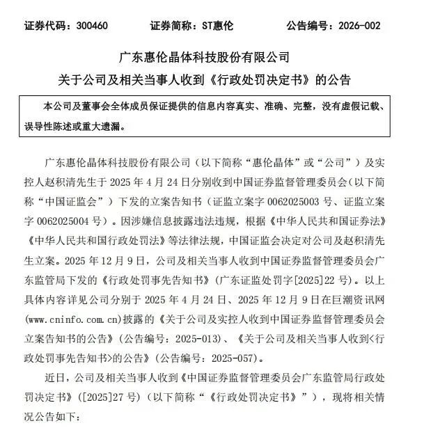 广东惠伦晶体科技股份有限公司(以下简称“惠伦晶体”或“公司”)及实控人赵积清先生于2025年4月24日分别收到中国证券监督管理委员会(以下简称“中国证监会”)下发的立案告知书(证监立案字0062025003号、证监立案字0062025004号)。因涉嫌信息披露违法违规,根据《中华人民共和国证券法》《中华人民共和国行政处罚法》等法律法规,中国证监会决定对公司及赵积清先生立案。2025年12月9日,公司及相关当事人收到中国证券监督管理委员会广东监管局下发的《行政处罚事先告知书》(广东证监处罚字[2025]22号)。以上具体内容详见公司分别于2025年4月24日、2025年12月9日在巨潮资讯网(www.cninfo.com.cn)披露的《关于公司及实控人收到中国证券监督管理委员会立案告知书的公告》(公告编号:2025-013)、《关于公司及相关当事人收到行政处罚事先告知书的公告》(公告编号:2025-057)。