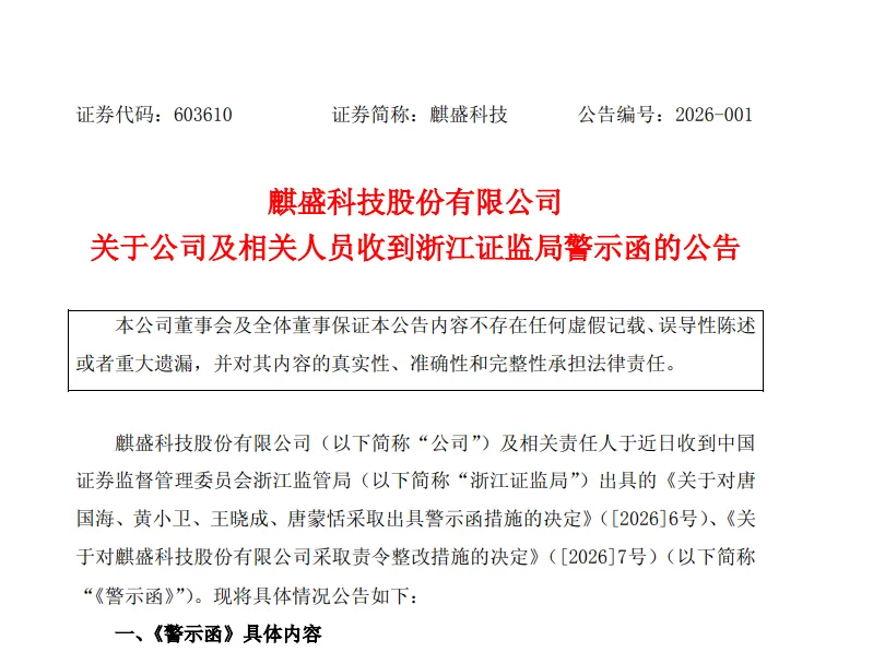 1月14日,麒盛科技(603610.SH)发布关于公司及相关人员收到浙江证监局警示函的公告。